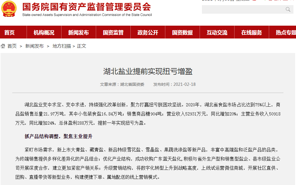 国务院国资委官方网站刊发《湖北盐业提前实现扭亏增盈》