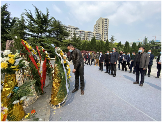 工作人员将花篮摆放在二七纪念碑前,集团公司党委书记、董事长刘江海迈步上前,仔细整理花篮缎带,大家鞠躬默哀,缅怀革命烈士。