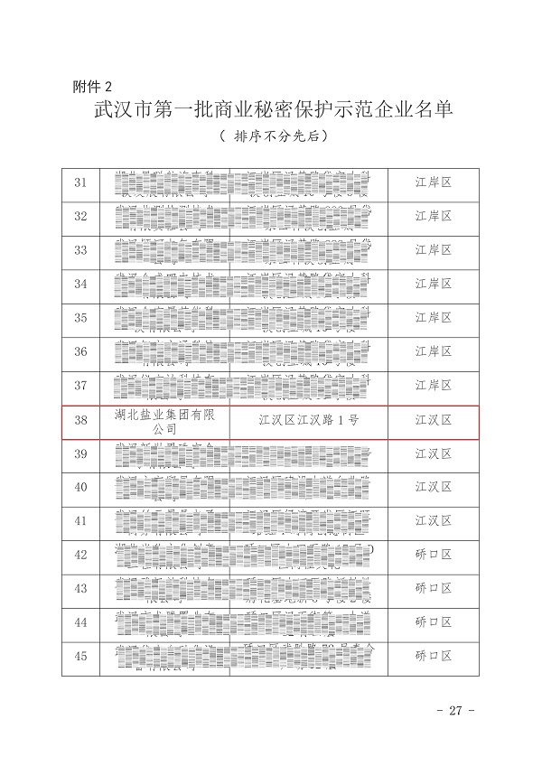 商业秘密是特殊的、重要的知识产权,是企业参与市场竞争的重要战略性资源,保护商业秘密就是保护知识产权,就是保护创新。本次入围首批市级商业秘密保护示范企业共93家,其中江汉区企业仅有4家,湖北盐业集团的成功入选,标志着在加强商业秘密保护,重视知识产权管理,夯实企业核心竞争力方面再上新台阶,卓有新成效。