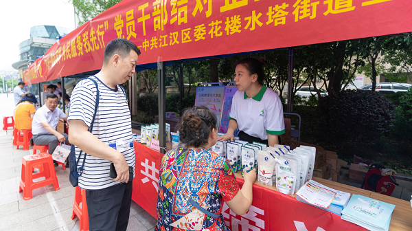 在江汉关社区广场,湖北盐业集团党员们向居民宣传盐的种类以及食用盐相关知识,科普洗涤盐,倡导健康用盐新理念。