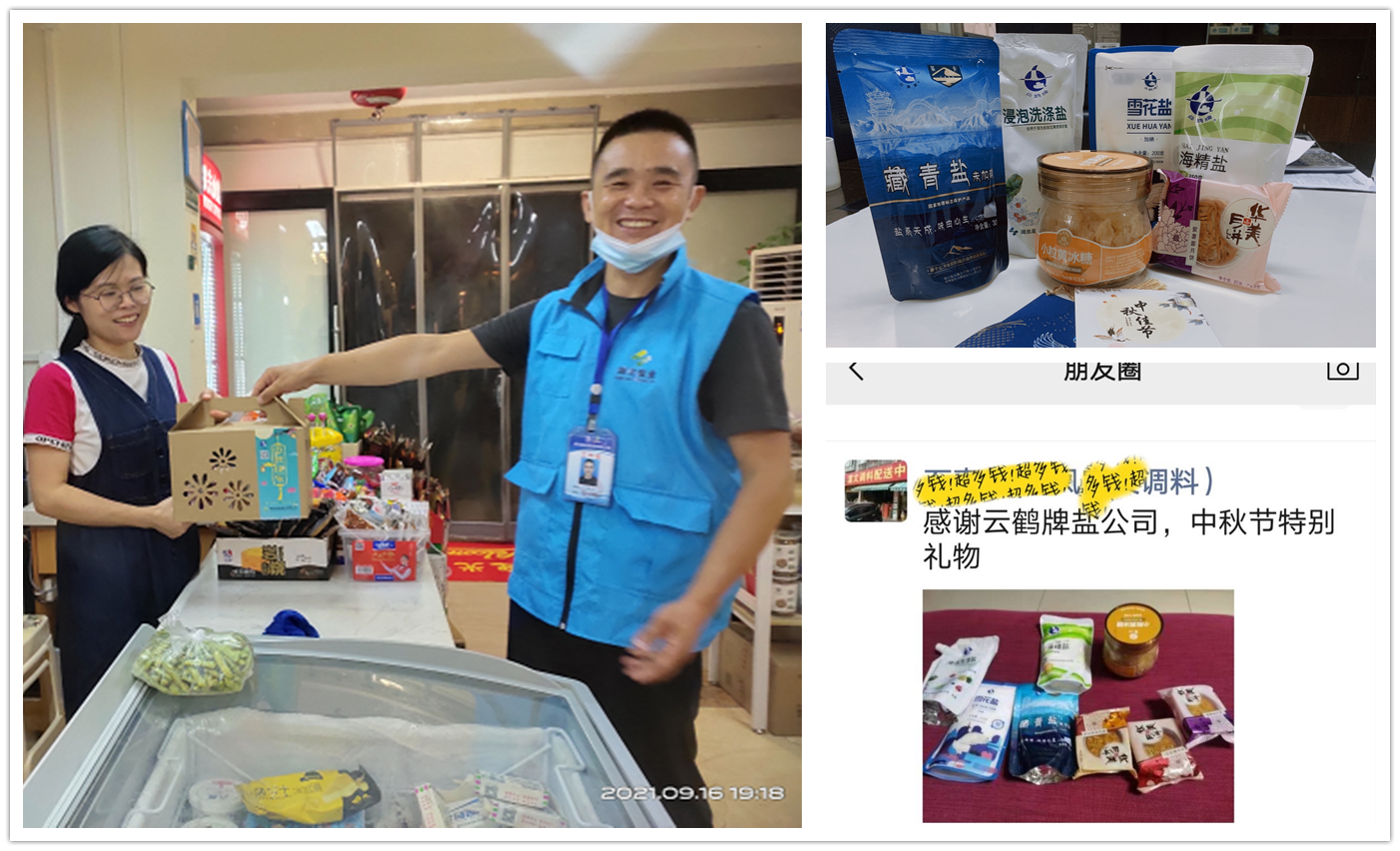 9月15日,恩施公司向近300位新老客户送出了美味月饼搭配雪花盐、藏青盐、雪砂冰糖等中高端商品的礼盒,制作了精美的中秋贺卡,表达了对客户及其家人们的祝福。