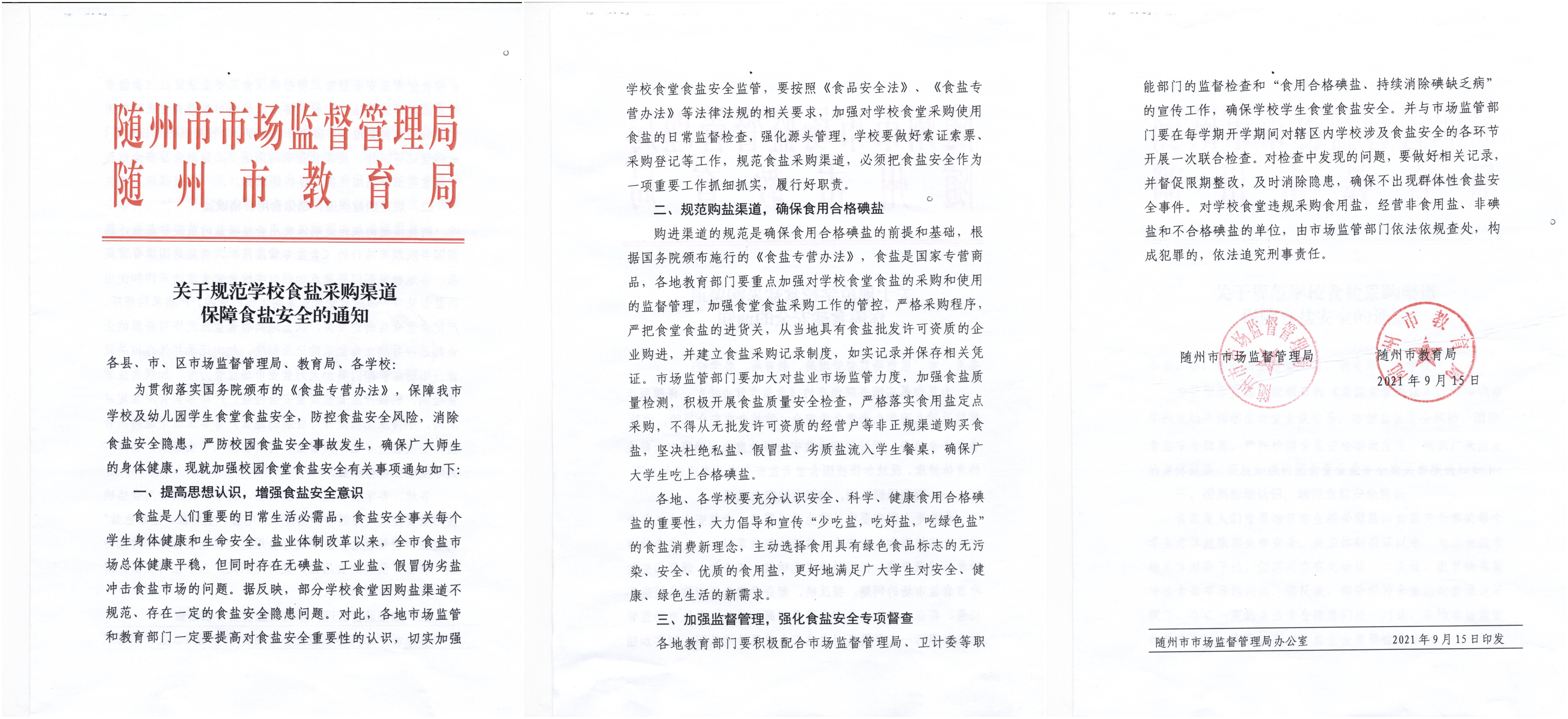 为充分发挥好职能部门的作用,规范学校食堂食盐购进渠道,保障全市学校食堂食盐安全, 2021年9月,随州分公司积极协调市市场监督管理局、市教育局联合下发《关于规范学校食盐采购渠道保障食盐安全》的通知,并开展了一次专项检查。