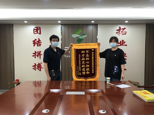 4月26日,江岸区丹水池街道江中社区向云鹤盐业包装公司赠送了一面“不忘初心担使命,助力社区抗疫情”的锦旗,对云鹤盐业包装有限公司全体党员在新冠肺炎疫情期间冲锋在前,坚守一线,为守护一方居民生命健康付出的努力和贡献表示感谢。