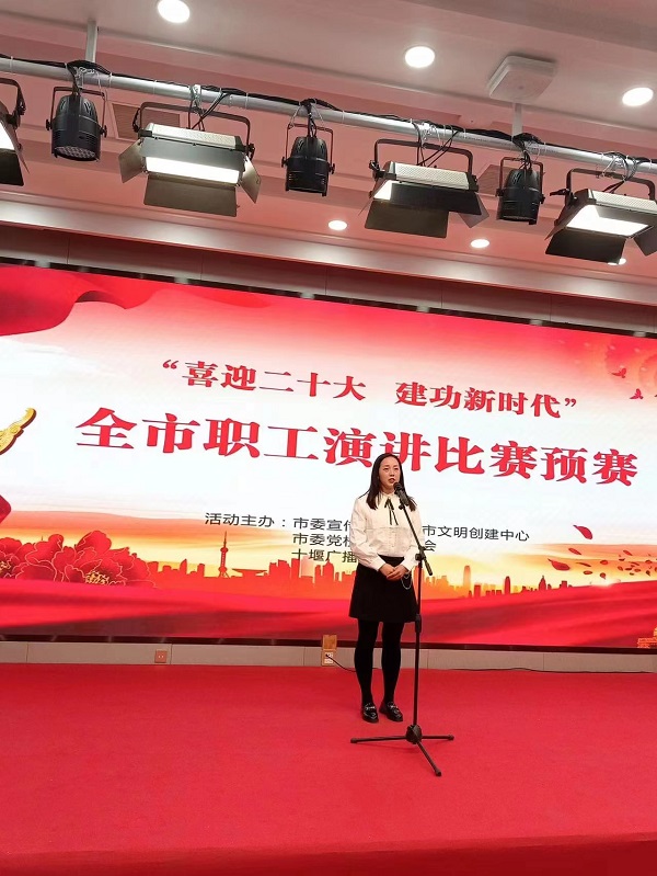 10月9日上午,湖北盐业集团有限公司十堰分公司职工代表付艳菲参加由十堰市总工会举办的“喜迎二十大 建功新时代”全市职工演讲比赛。